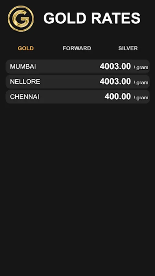 Gold Rates is an mobile app to see live gold rates. We are providing reference data to enable user understand the gold rates better. LIVE GOLD RATES , LIVE SILVER RATES , USDINR , GOLD SPOT, SILVER SPOT rates all in one APP . GOLD RATES of Multiple locations all in one APP. Live gold rates of Mumbai, Gold rates of Chennai, Gold rates of Hyderabad, Gold rates of Vizag, Gold rates of Vijayawada. Gold rates of Nellore. Gold rates of Ahmedabad, Gold rates of Kolkatta, All in one APP.
