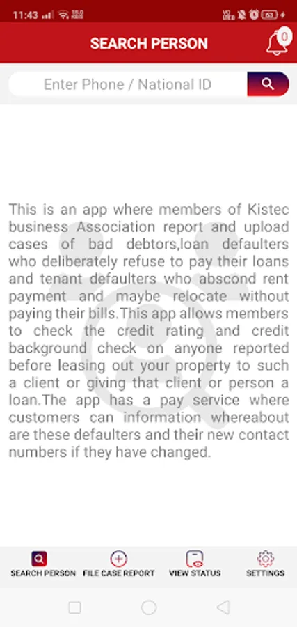 This is an app where members of Kistec business Association report and upload cases of bad debtors, loan defaulters who deliberately refuse to pay their loans and tenant defaulters who abscond rent payment and maybe relocate without paying their bills. This app allows members to check the credit rating and credit background check on anyone reported before leasing out your property to such a client or giving that client or person a loan. The app has a pay service where customers can information whereabout are these defaulters and their new contact numbers if they have changed.