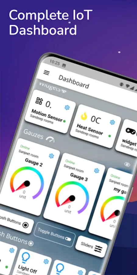 - Create Push button, Toggle button, Sliders and Color picker to control various devices