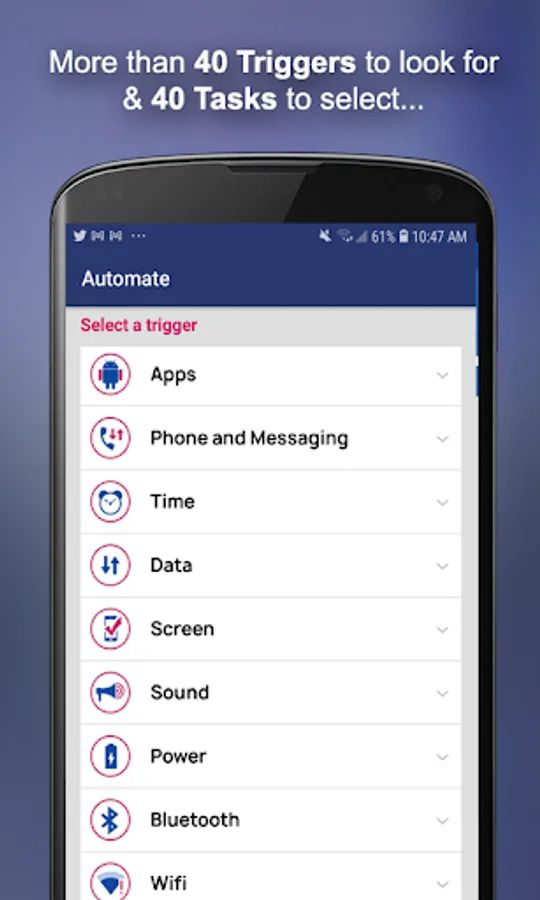 Automate - Phone Automation with Tasks & Triggers new best app 2019 unique interface offers a Wizard that guides step by step through the configuration of your first automate It is also possible to use an existing template from the template section and customize it to your needs. android Phone. With more than 50 triggers and 50 tasks, the app is almost a total Android best Automation Kit.