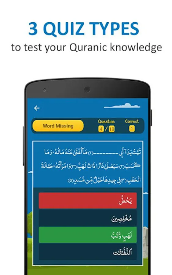 • The three type of quiz option are word missing, ayah missing and guess the surah