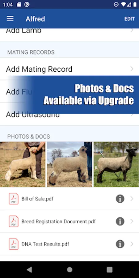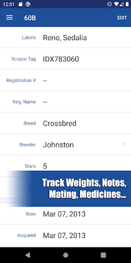 - Keeps track of all the details about each of your animals, including name, registration number, sex, DNA, and dozens of other pieces of information