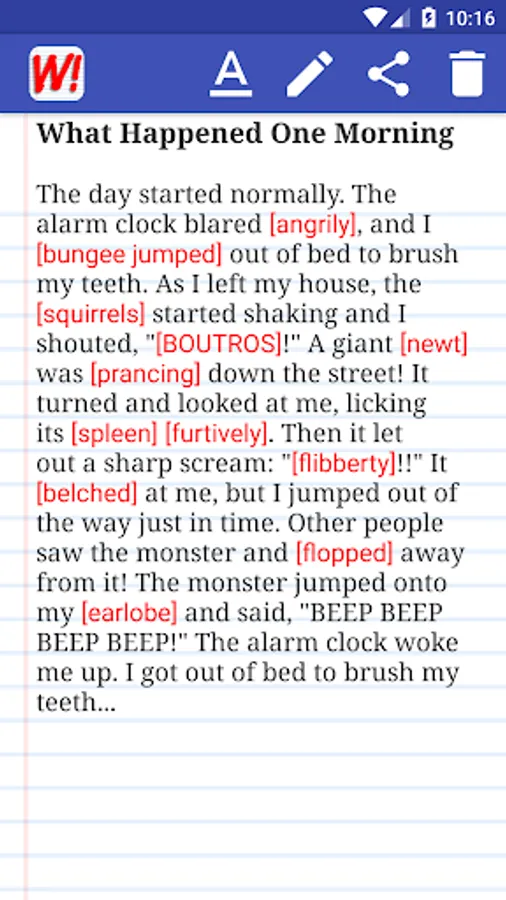 This is how it works: First, choose a Wordventure! story. Pick Nouns, Verbs, Adjectives, Adverbs, etc., save your completed Wordventure and then read YOUR hilarious story!