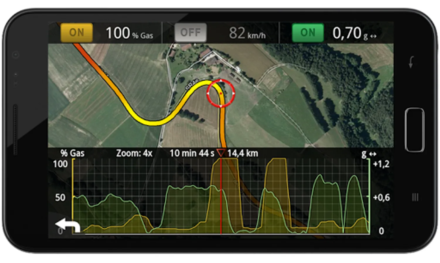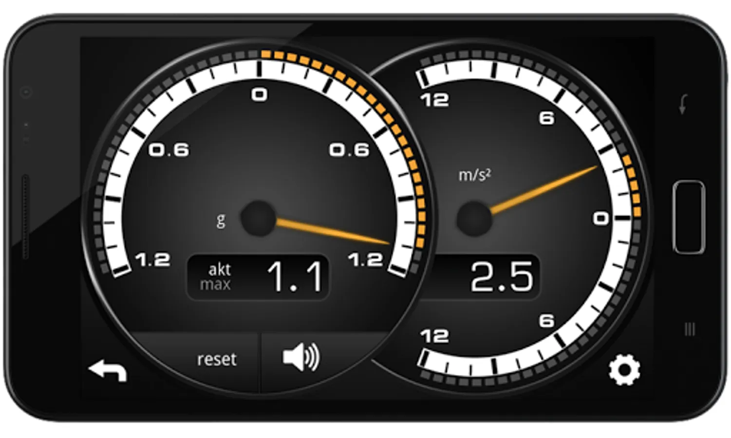 Shows lateral and linear acceleration with maximum value notifications
