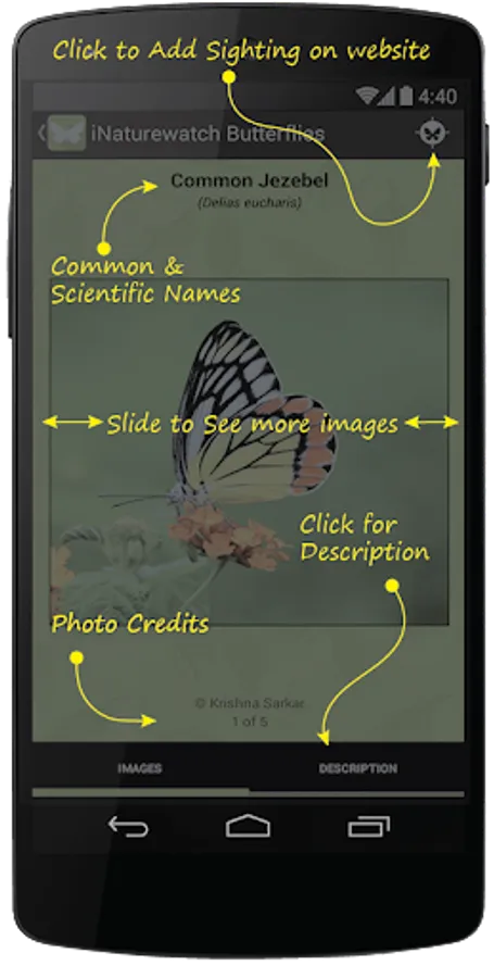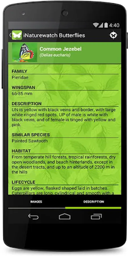 The app describes 50 common Indian species of butterflies along with their pictures, common English and Latin name, wingspan, geographical range, habitat preferences, host plants, life cycle, similar species and interesting facts if any. The language has been kept non-technical however incase of unavoidable technical words, a glossary if provided to explain these terms. Once you download, please keep updating your app as we will be improvising and rectifying some of the technical and information errors. In case you come across a butterfly which is not available in this app, we have provided list of books and online resources wherein you could get your butterfly identified. Happy Butterflying!
