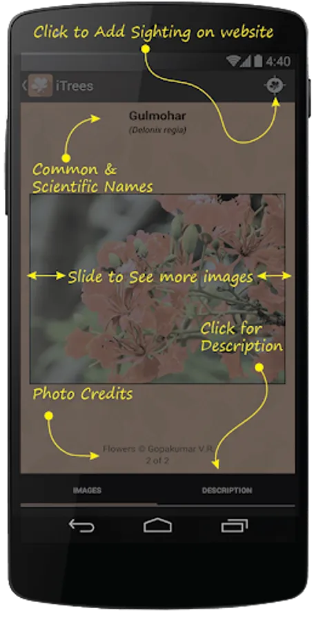 The app describes 50 species of trees along with their pictures of leaf fruit, bark, common English and Latin name, height, geographical range, details about leaves, flowers, fruits, uses and associations. The language has been kept non-technical however incase of unavoidable technical words, a glossary if provided to explain these terms.Once you download this Android app either on your smartphone or tablet, please keep updating your app as we will be improvising and rectifying some of the technical and information errors. In case you come across a tree which is not available in this app, we have provided list of books and online resources wherein you could get your tree identified. Happy Treewatching!