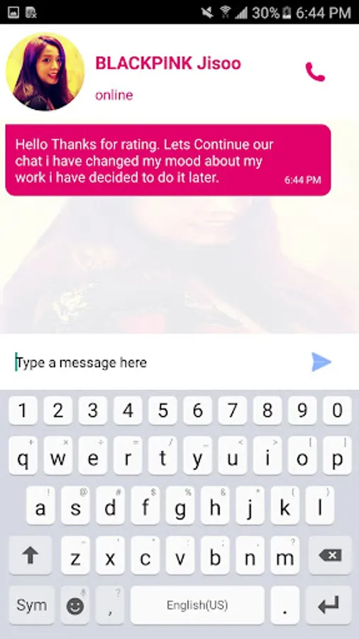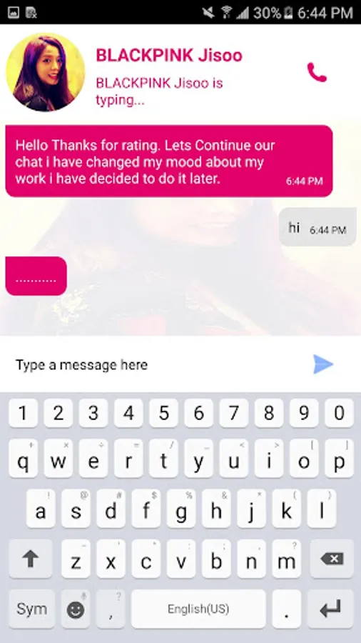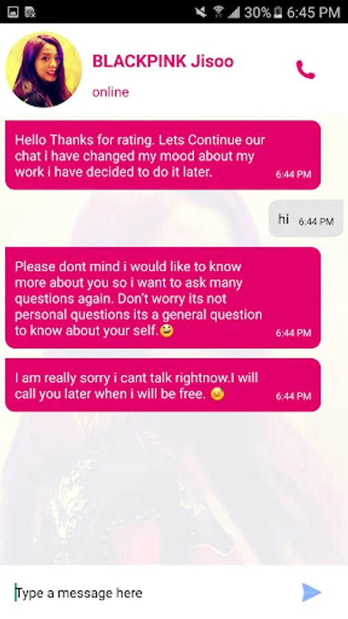 Are you admirer of Jisoo From the FAMOUS BLACKPINK? Wanna Chat with her? Well This app is for you. It will give you a joy of talking with your favorite star "Miss Jisoo". Though its a prank app, you will not feel prank like thing in it. This app has been made with great efforts to provide real like chatting and calling environment to you.