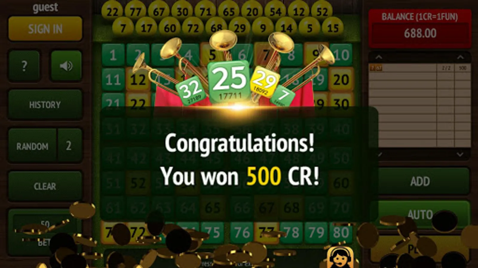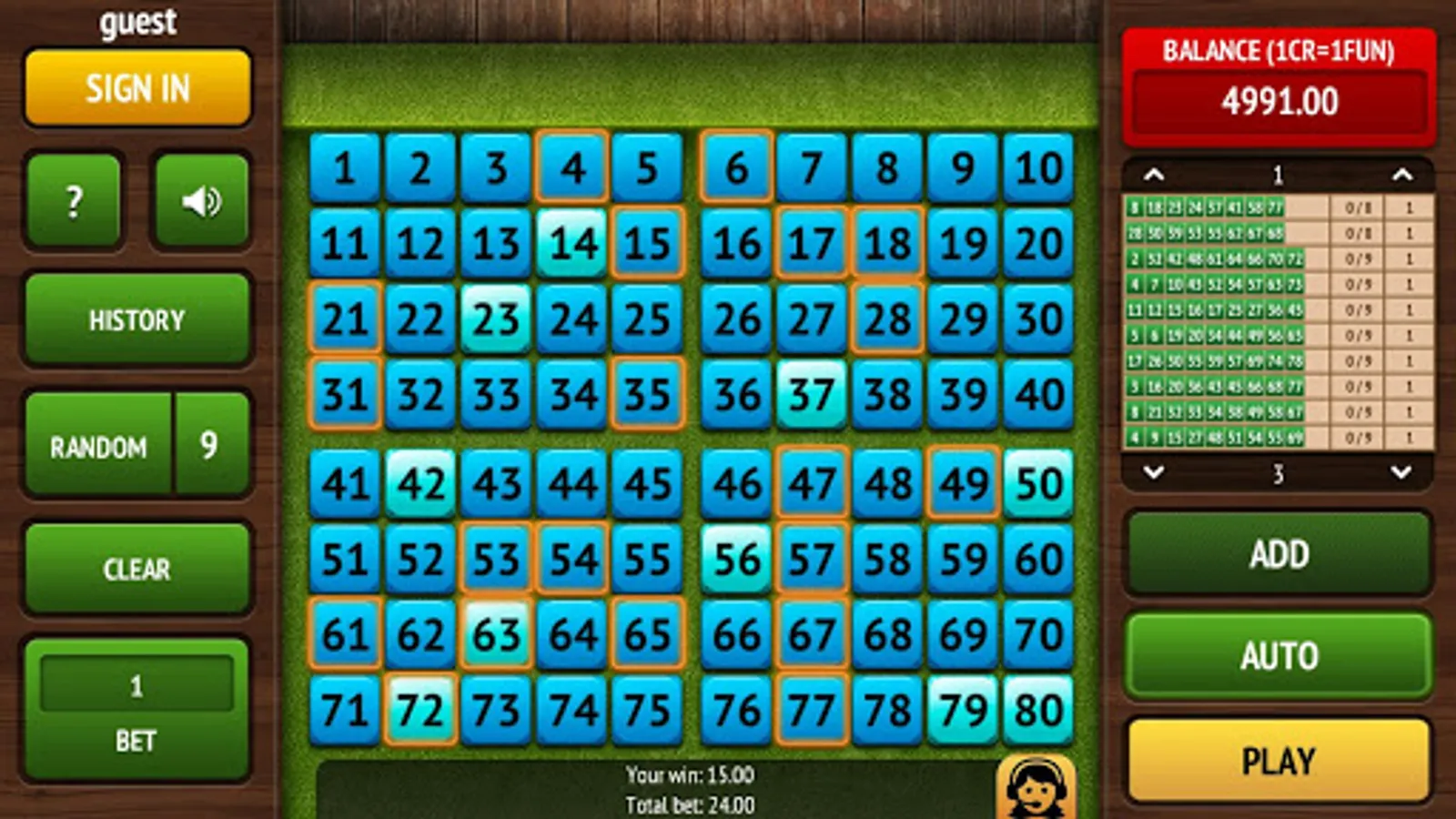 As soon as the drawing begins, the game selects 20 winning balls. Then the game will calculate your winnings according to the number of cells you have guessed.