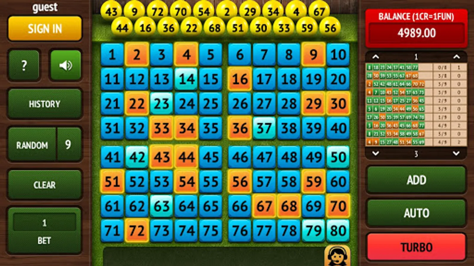 Turbo Keno features:
