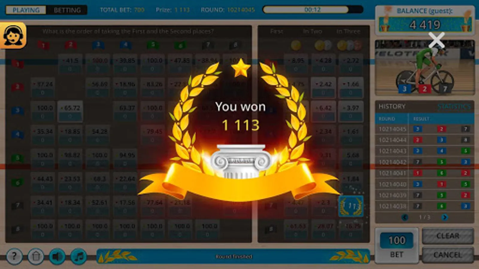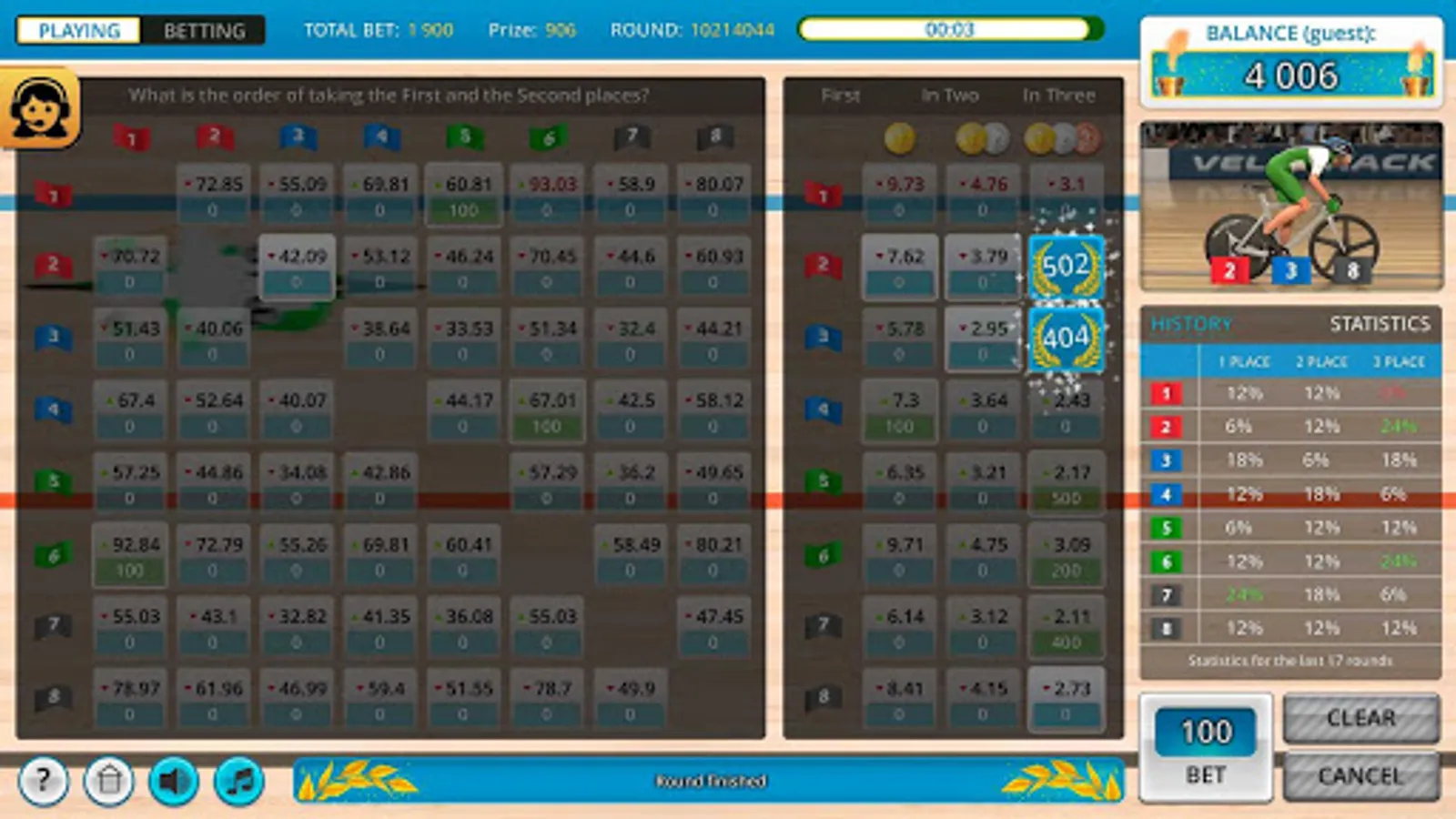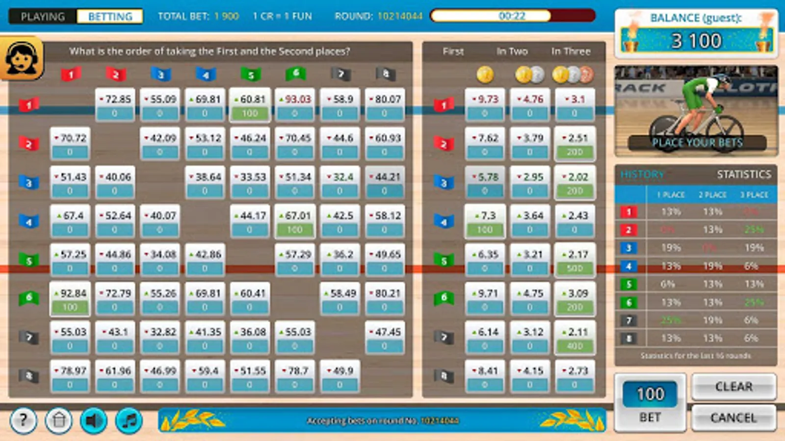 The concept of the game is simple: every couple minutes, a new race is held between six simulated cyclists. Each individual Velodrome Race consists of a betting period (100 seconds) and a playing period (80 seconds), while the sum of all bets can not exceed 5000 per round.