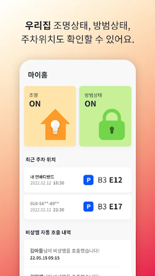 * Based on the registered occupancy information, lighting information, crime prevention information, recent parking location, and emergency bell alarm are provided.