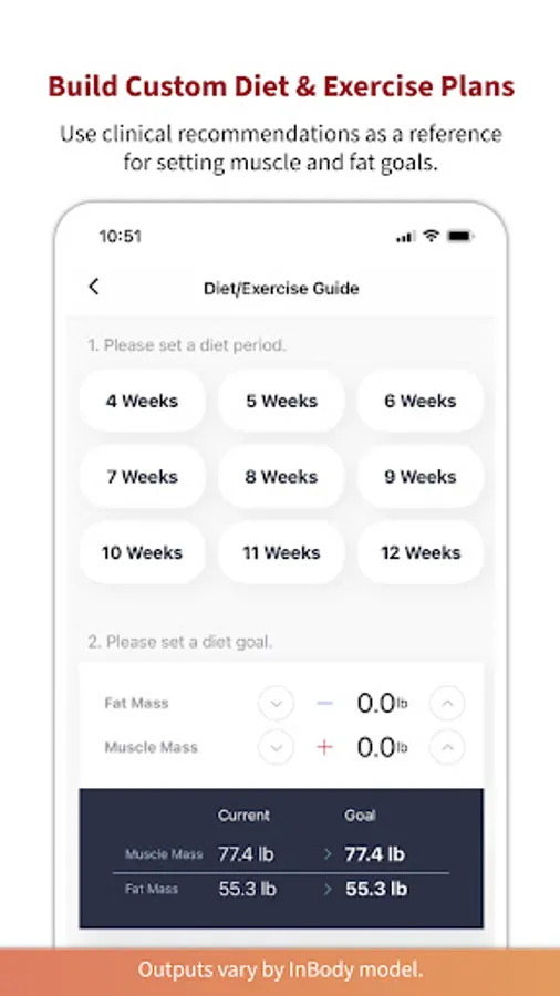 - A digital diet and exercise log that can be used to fit healthy changes into your current lifestyle. Within this section, you can also set attainable muscle and fat goals based on scientific data formulated by the InBody Clinical Research team. *Please note: The guide(s) are for reference purposes only and should not be taken as professional medical advice.