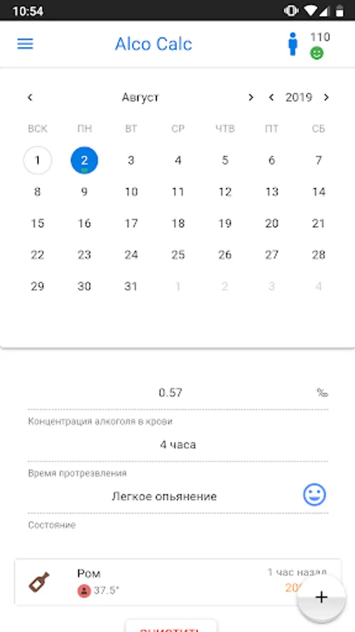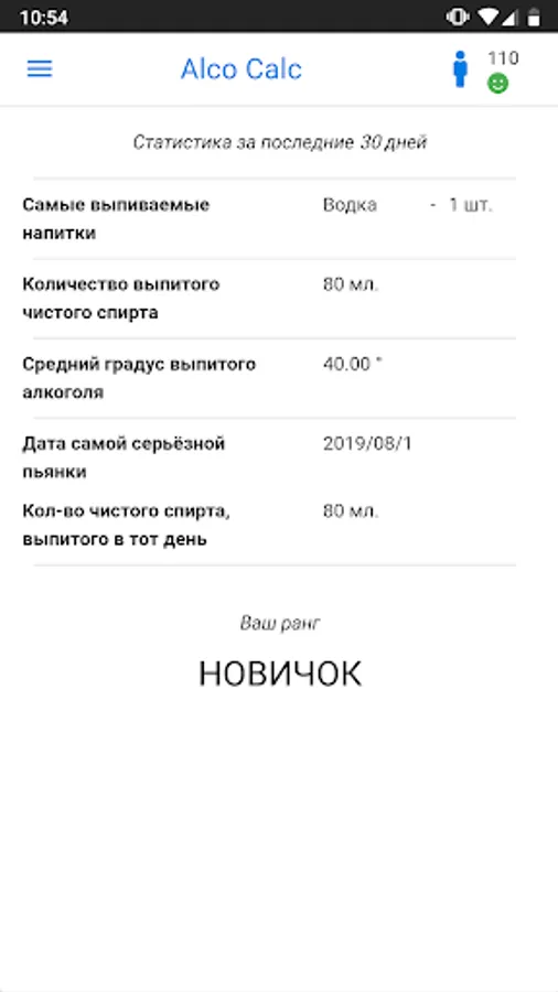 The application will allow you to get statistics for the last 30 days about what you drank and how much. To find out your degree of intoxication, you need to make a daily appearance of the type and amount of alcohol you drink. In the end there is an opportunity to find out your rank - the level of endurance in this field.
