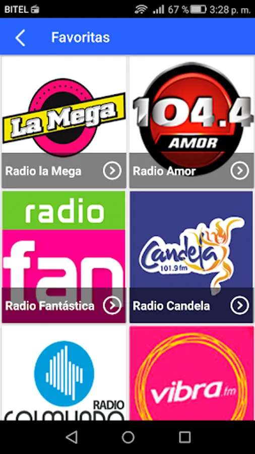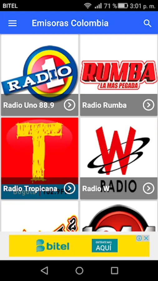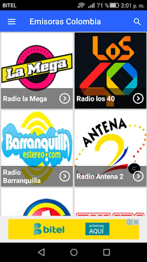Radio Mega, Radio 40, Radio Barranquilla, Radio Antenna 2, Radio One 88.9, Radio Rumba, Radio Tropicana, Radio W, Radio Oxygen Radio Love, Radio Snail, Radio Kiss, Radio Activa Radio HJCK, Radio RCN, Radio contagion, Radio loving, Radio energy, Radio FM, Radio X Stereo, Radio Fundingue, Radio Queen, Olympic Radio, Hot Radio, Radio Maria, Radio Melody, Radionics Radio, Radio Super, Radio Vibra, Radio Candela, Radio pachanguera, Colombia Shaft Radio, Radio Latina Stereo, Radio Colmundo radios and many more.
