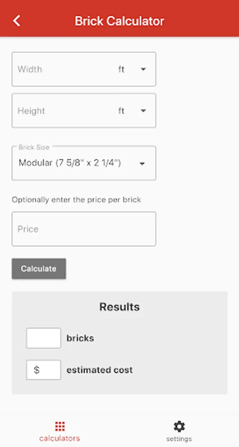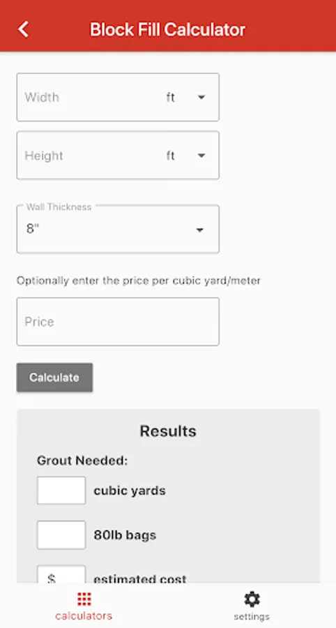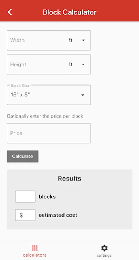 Estimate blocks or bricks needed for a wall, mortar, concrete fill, concrete, or gravel.