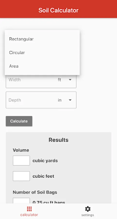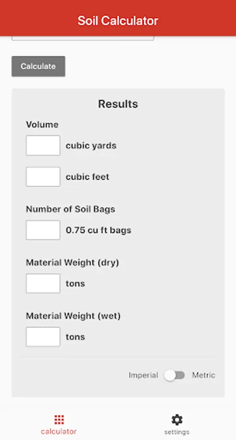 The app outputs the amount of soil required in cubic yards, cubic feet, tons, metric tons, cubic meters, liters, and the number of bags of soil needed.
