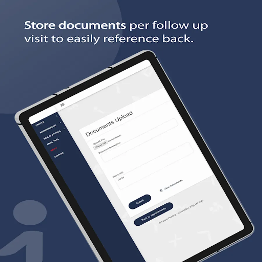 * Separate profiles for doctor and patient, linked at registration with unique features per user.