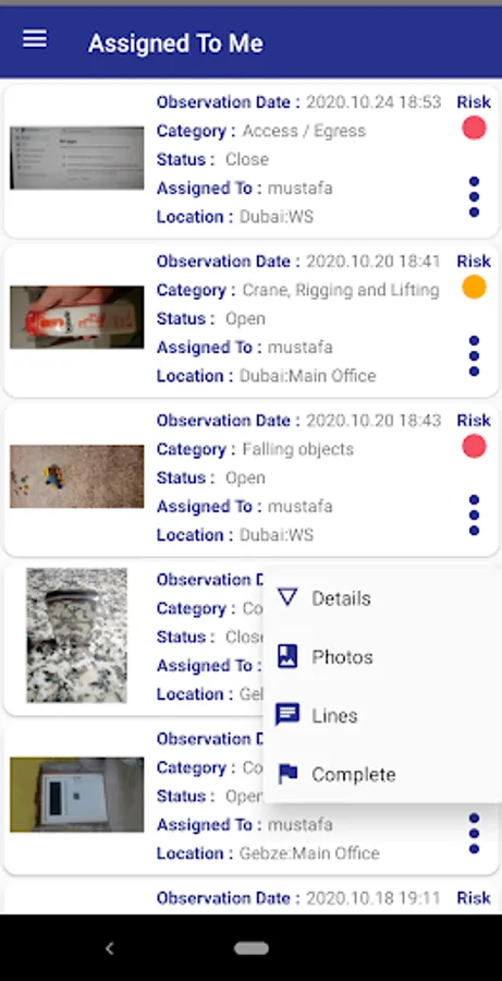 Each observation record will add value to our Department to measure Risks , Prevent potetintial damages and keep our workers safe.in observations screen, you can create Observation Records &assign to responsible person, meanwhile you can add pictures and Corrective action notes.