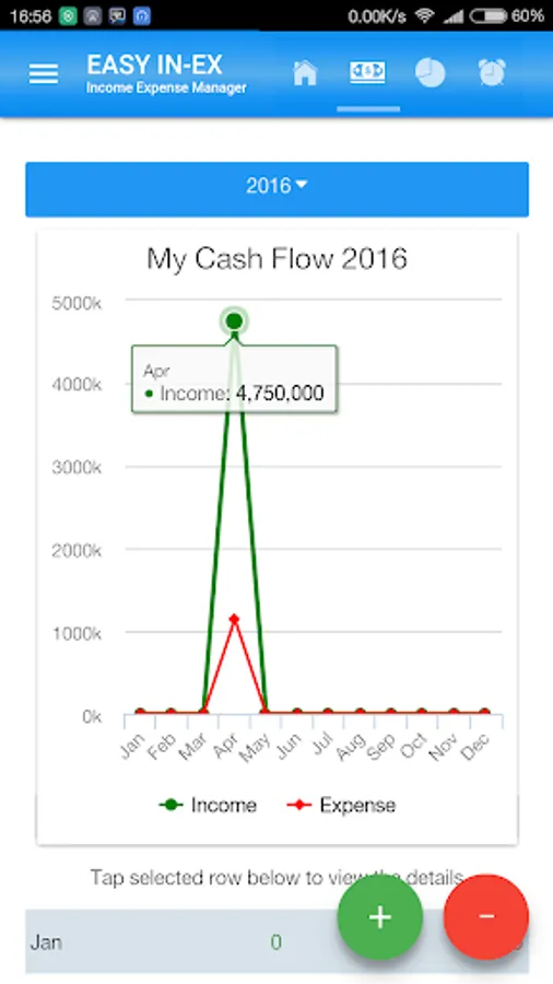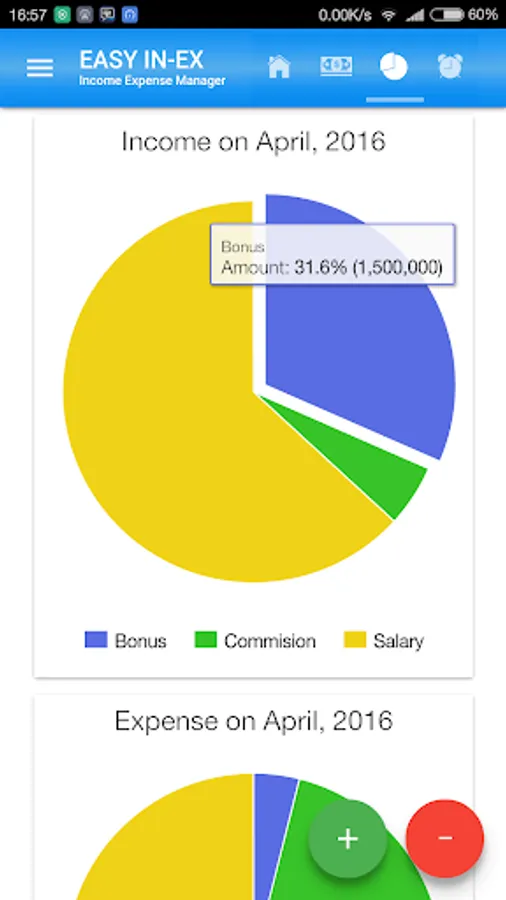 * Graph report for visual easy understood. Line chart to show your income and expense with one year view. Diagram chart to show how high a value for the category of income or expense.