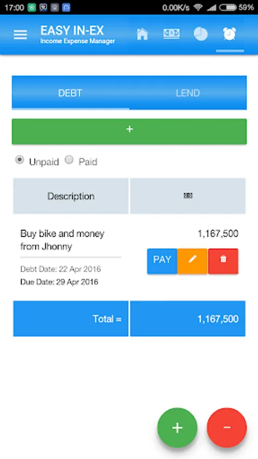 Debt and Lend is integrated with income and expense. If you have paid debt, you can input data to Debt page and click "Pay" button ("Get" button for Lend), and when it saved, data will be integrate with expense. So, you doesn't need input data twice.