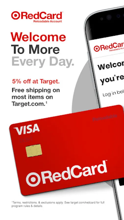 Get more of what you love with RedCard Reloadable Account, including 5% off at Target¹ , free shipping on most items on Target.com², and free cash reloads at any Target location³.