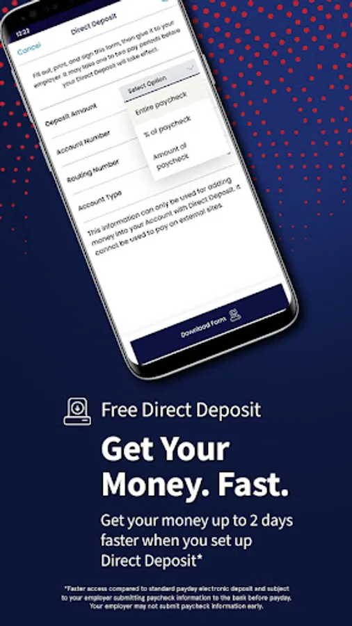 ²Faster access compared to standard payday electronic deposit and subject to your employer submitting paycheck information to the bank before payday. Your employer may not submit paycheck information early.