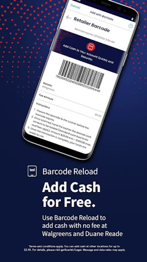¹Terms and conditions apply. You can add cash at other locations for up to $3.95. For details, please visit getScarlet.com/Legal. Message and data rates may apply.