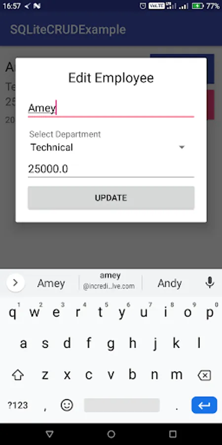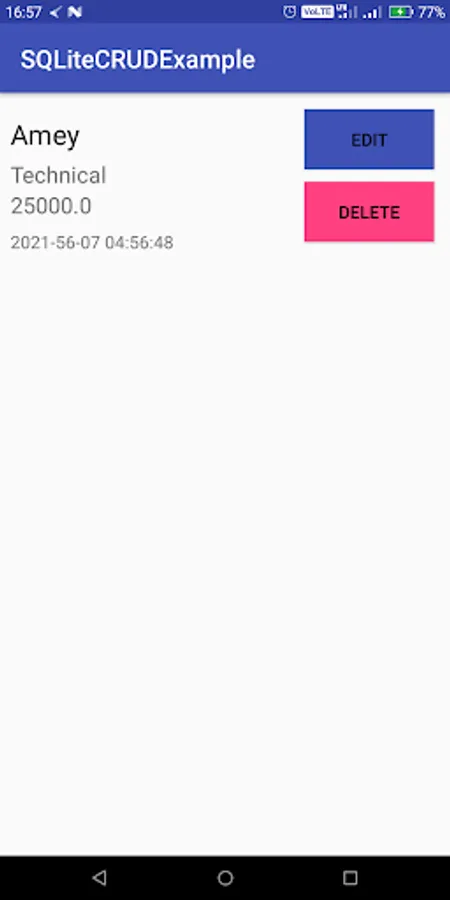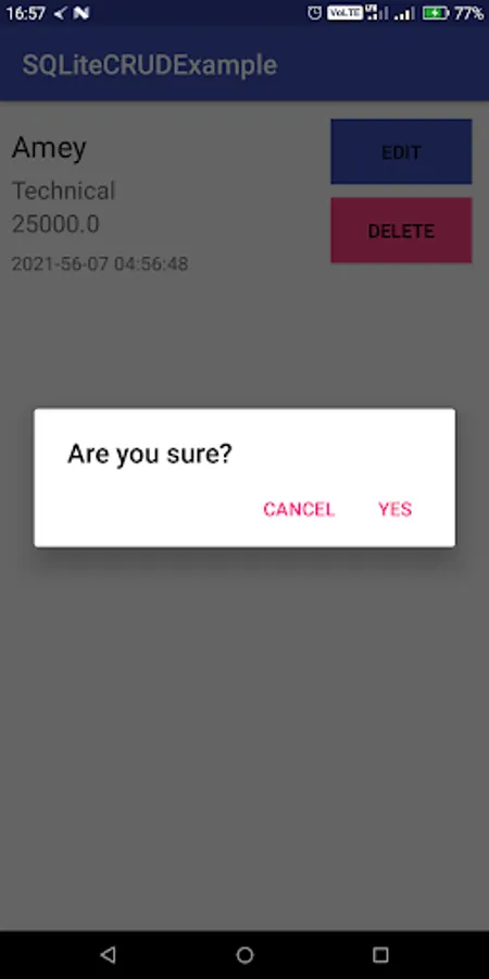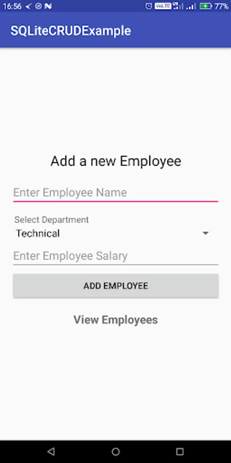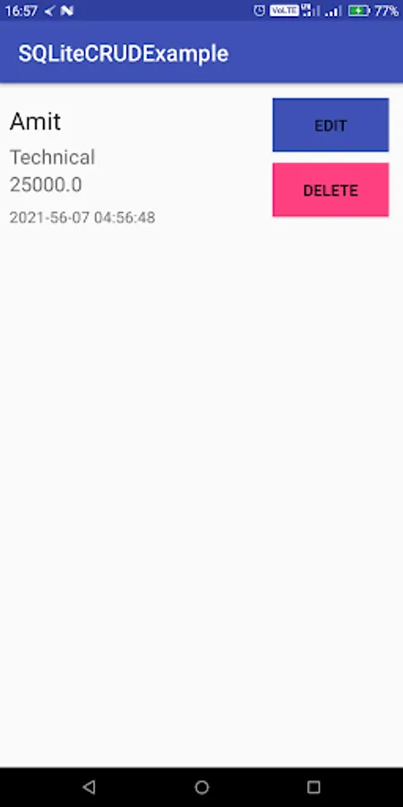 This Android SQLite Database Example will cover Creating Database, Creating Tables, Creating Records, Reading Records, Updating Records and Deleting Records in Android SQLite Database