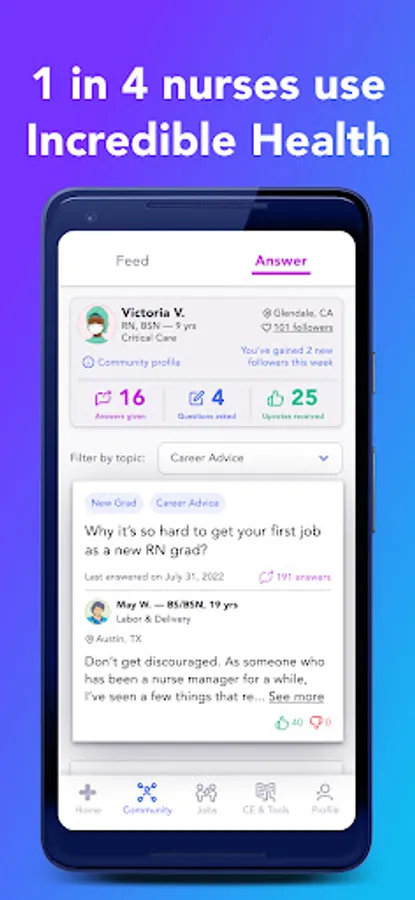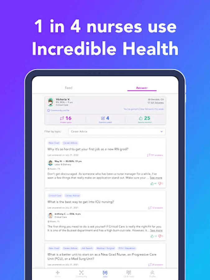 Ask questions, give advice, and share with your nurse community. Looking for career advice or suggestions for dealing with a stressful shift? The Incredible Health nurse community is a thriving and welcoming place for support.