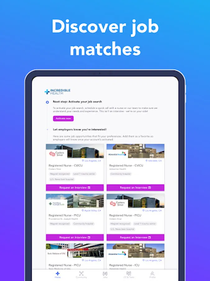 Incredible Health is the easiest way for RNs, nurse practitioners, and nursing leaders to find new permanent jobs, earn continuing education credits, and get career advice from thousands of other experienced nurses. You’ll have all the tools you need to advance your career.
