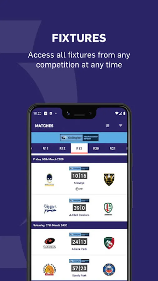 Never miss a moment from the best domestic rugby competition in the world! Watch all the latest Gallagher Premiership Rugby highlights every Monday morning. Keep up to date with lives scores every weekend, plus all fixtures, results & tables so you can follow your team across Gallagher Premiership Rugby, the Premiership Rugby Cup and European competitions. We also have the latest news, videos and exclusive content so you have everything you need to follow Premiership Rugby, all in one place.