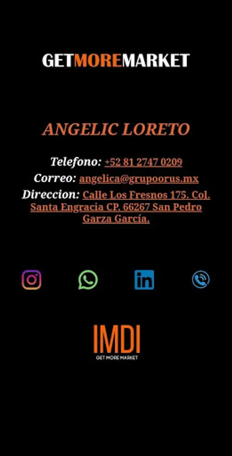 Tarjeta de presentacion de Grupo IMDI Angelica Loreto