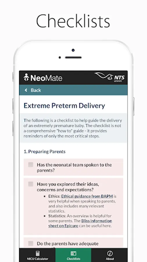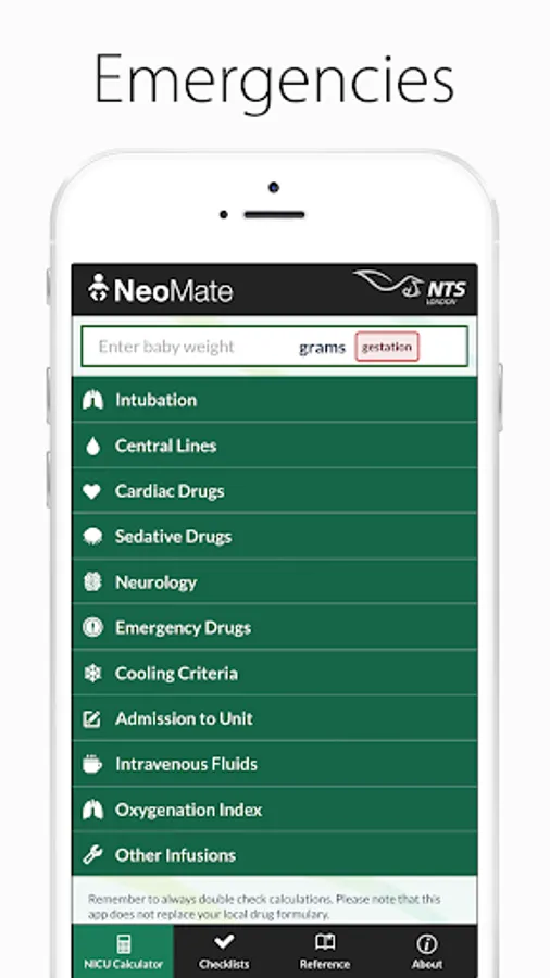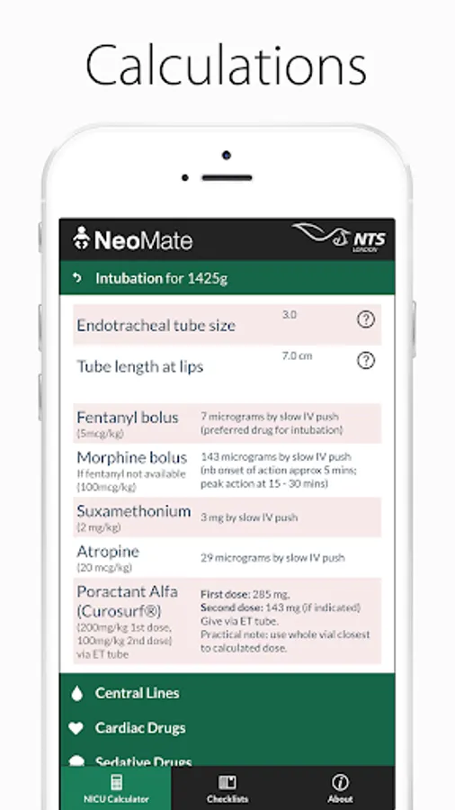 NeoMate helps neonatal staff to provide the best possible care for unwell babies in the hospital setting. The app offers drug, infusion and fluid calculations, concise checklists for common clinical problems, and quick reference information to guide acute neonatal intensive care.