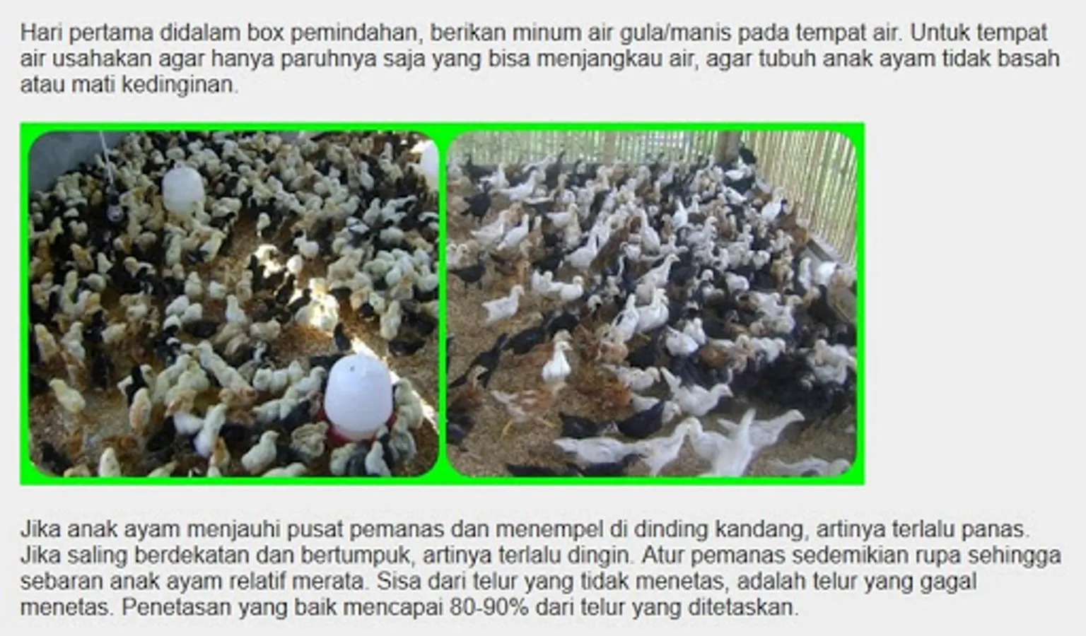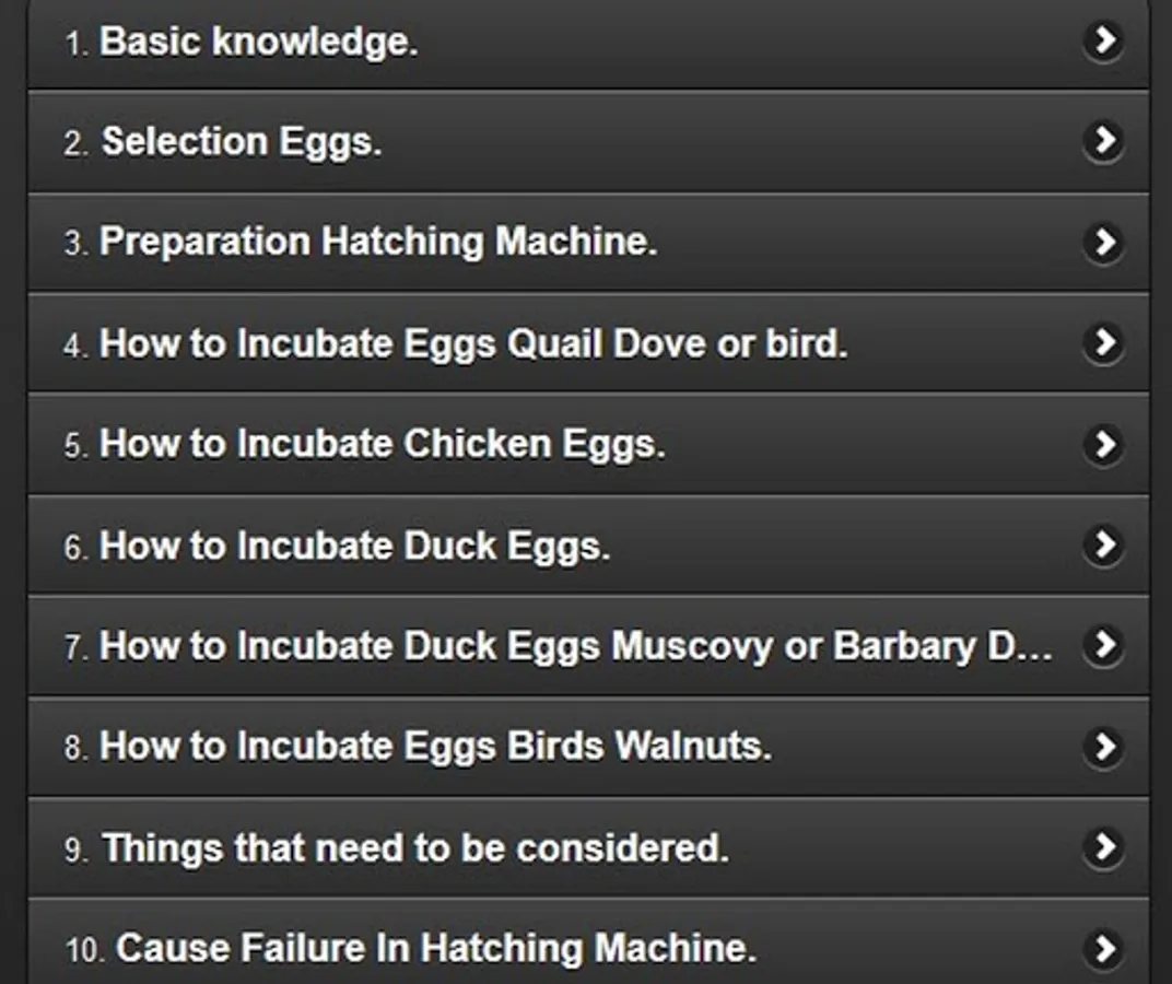 This application contains how to incubate eggs using a simple egg hatching machine and automatic egg hatching. there is an image that will make it easier for you to do the hatching process yourself. when doing hatching, what must be done is also explained in this application.