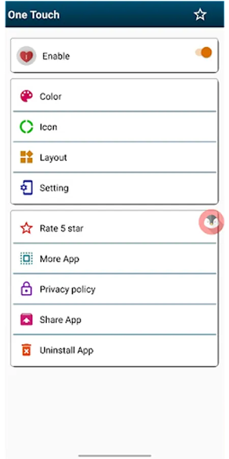With a floating panel on the screen, you can easily use your Android smart phone. More conveniently, you can quickly access to all your favorite apps, games, settings and quick toggle. You can use smart clean function to clean running background apps, help your phone cleaner and faster. One Touch is also an ideal app to protect the physical buttons (home button and volume button). It is very useful for big screen smart phone.