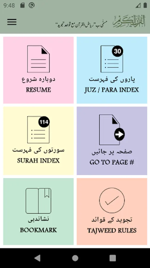 By the grace of Allah Subhanahu wa ta'ala, we are happy to announce the Riyazul Quran Mobile Application with the Tajweed Rules for the convenience of the reader. Application has been designed to make sure it will be easy to use for all group of user's & accessibility of the option is convenient to the user.