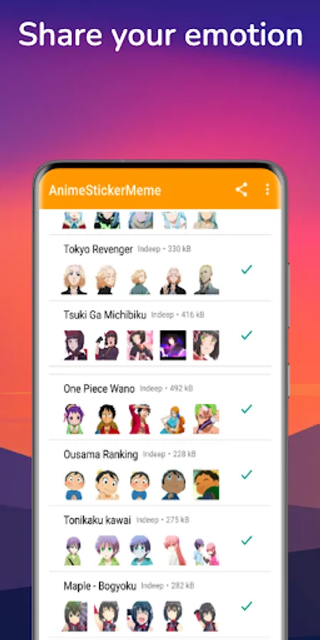 This amazing Anime stickers for WhatsApp application have many more amazing anime list/categories stickers for WhatsApp like Male anime heroes, female anime character/cute anime girls stickers, Anime memes stickers and funny face reaction stickers.