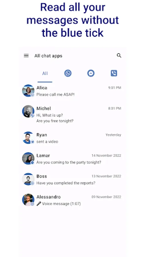 When you receive a message from a chat app, it will also be displayed in NoBlueTick. There, you can read it whenever you want, without any of your friends knowing that you have seen it.