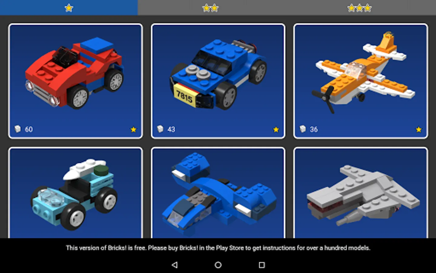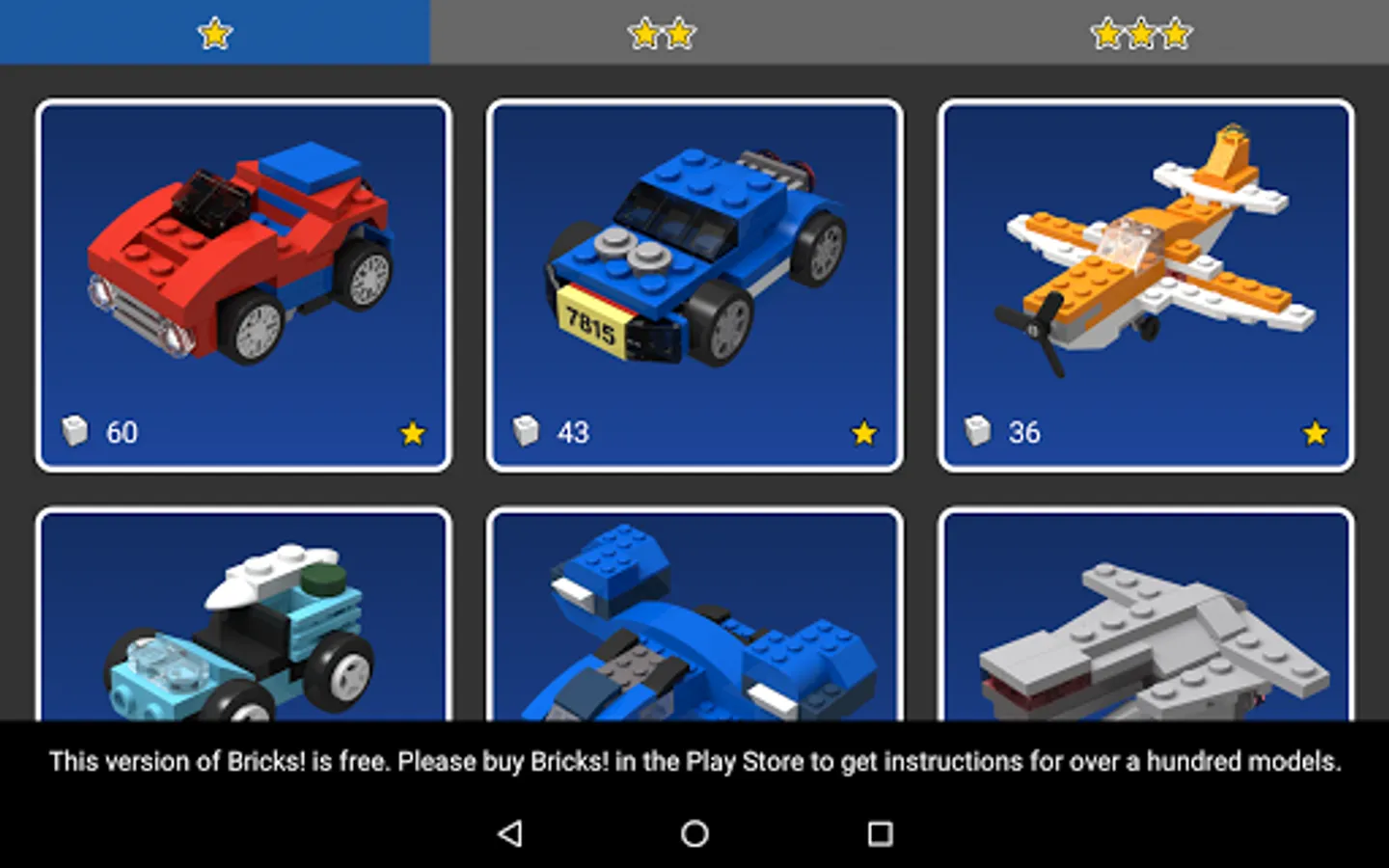 Bricks! comes in lite and regular flavors. The lite version offers 18 models, 6 for each challenge level. The regular version offers over a hundred models, providing that much more inspiration for your children. While the lite version is and will remain free, we hope that you will consider buying the regular version as well.
