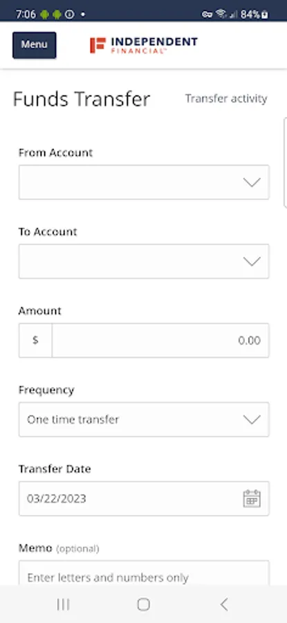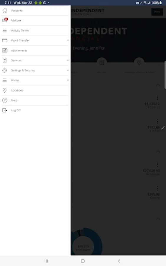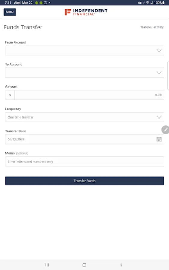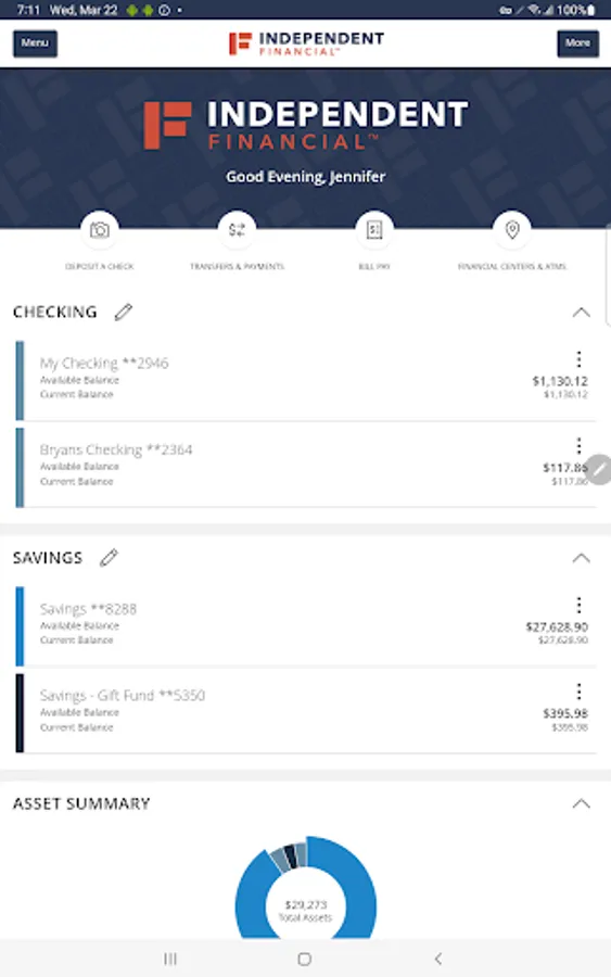 The Independent Financial mobile app provides access to real-time account balances, mobile deposit, mobile bill pay, fund transfers, account tracking, and branch or ATM locating.