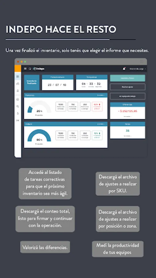 Once the count is finished you will be able to download the reports of the valued differences ready so that you only have to adjust in your system, and it will detail a list of corrective tasks generated by the users at the time of the count, so that your inventories are increasingly agile