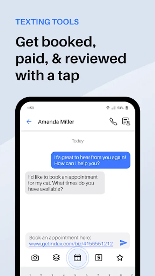 Access shortcuts for interacting with customers right from your text thread using Index’s Texting Toolbar. Create reusable templates for common questions, book appointments, request payment, collect reviews, and more—all with a tap.