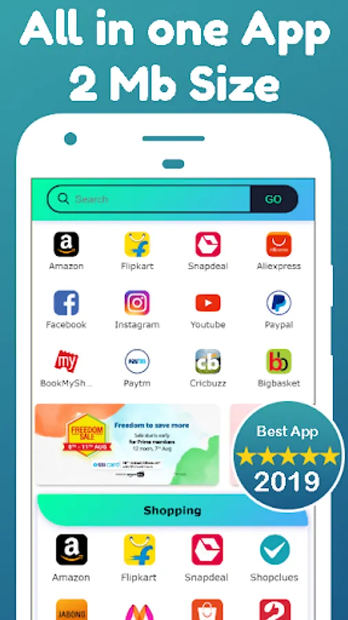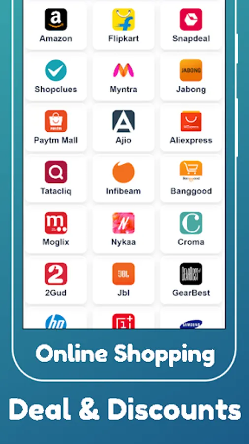 All in one Online Shopping app idas a shopping destination for more than 500+ online stores. Some of the major online shopping sites Amazon, Flipkart, Paytm, Snapdeal, Shopclues, Myntra, Ebay, jabong, Moglix, olx, zivame, abof, Ajio, TataCliq and many more