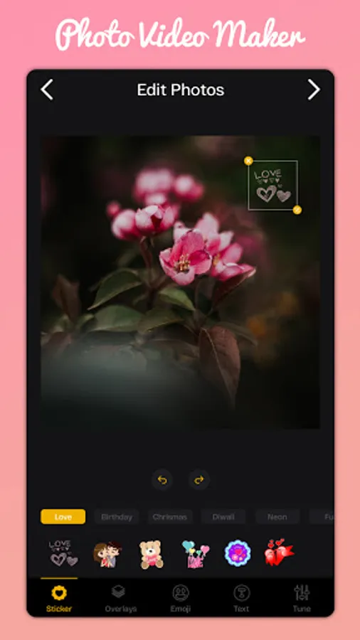 -Add sticker to video with: love sticker, couple sticker, heart sticker, and many more.