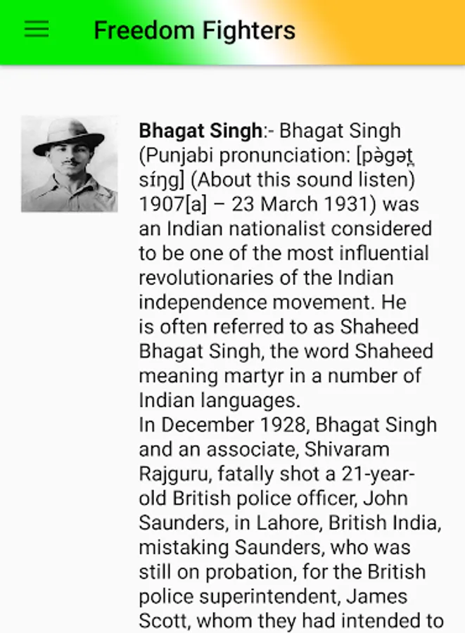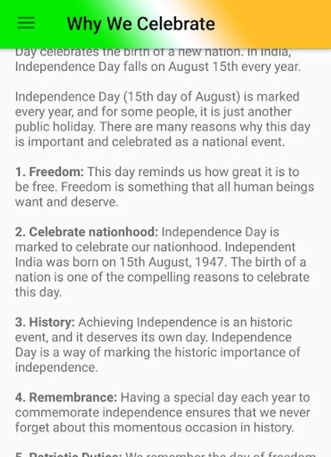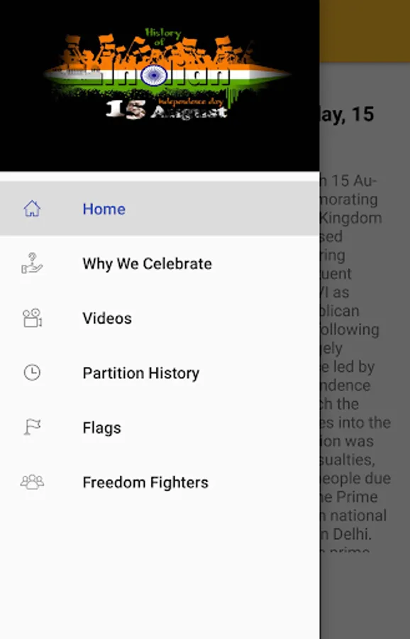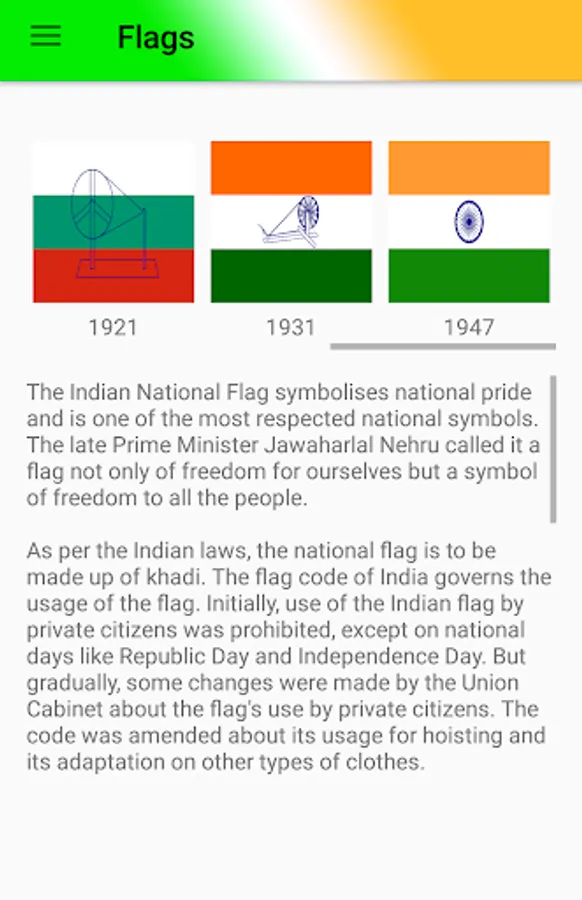 This application is subdivided into different historical events in chronological orders for the ease of read and watch videos. This pocket application will provide you the detailed information about Indian independence day 15th of August 1947 and also about Indian flags variations year wise, Indian maps changes, dynasties, freedom movements etc.