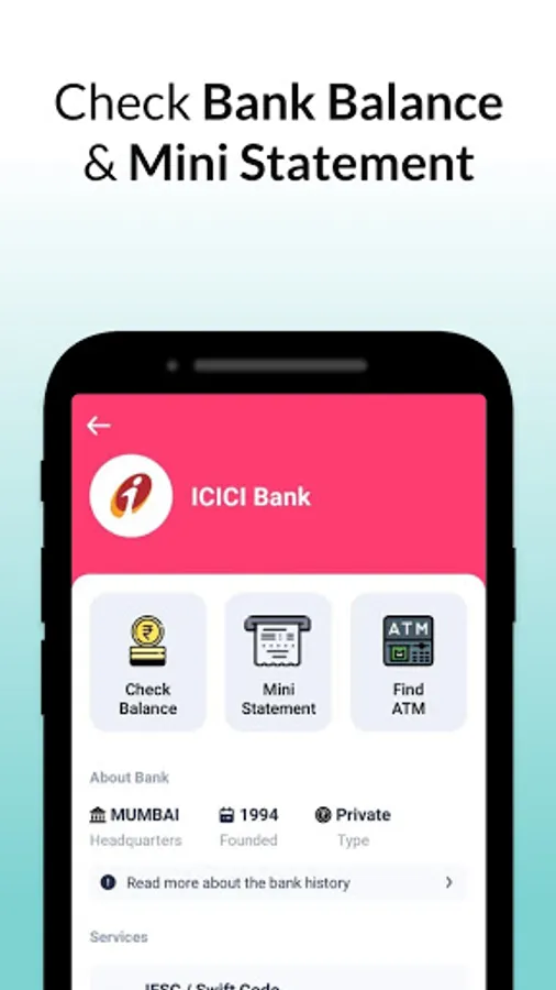 Bank Info app provides all bank balance check & enquiry app lets you check account balance without even login to your bank account or net banking or any mobile banking. You can do the one click balance enquiry by just a missed call or on a single tap.