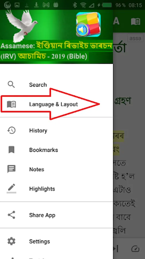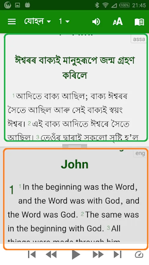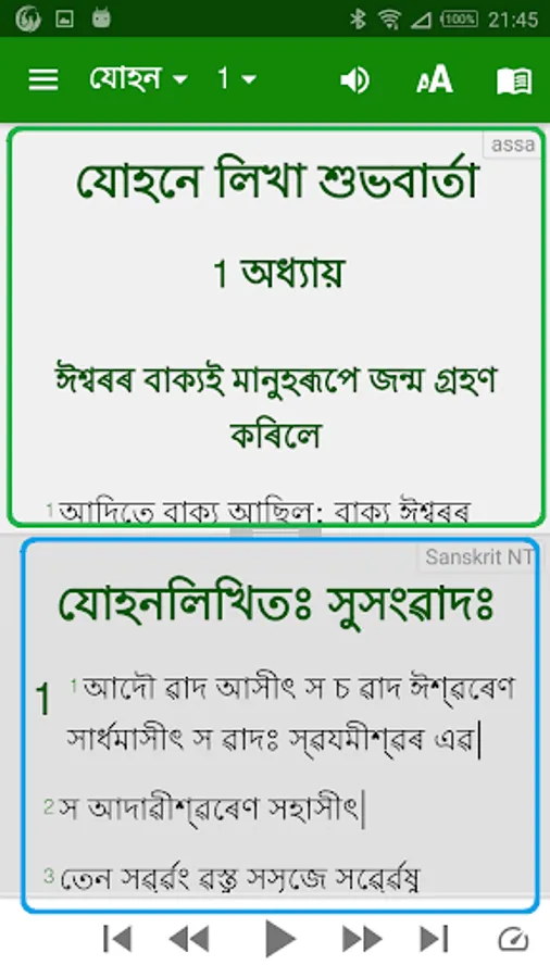 - "verse by verse" to display a verse in Assamese followed by the same verse in English, or (for the New Testament) in Sanskrit.