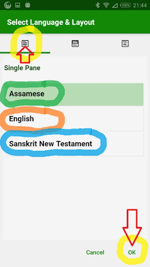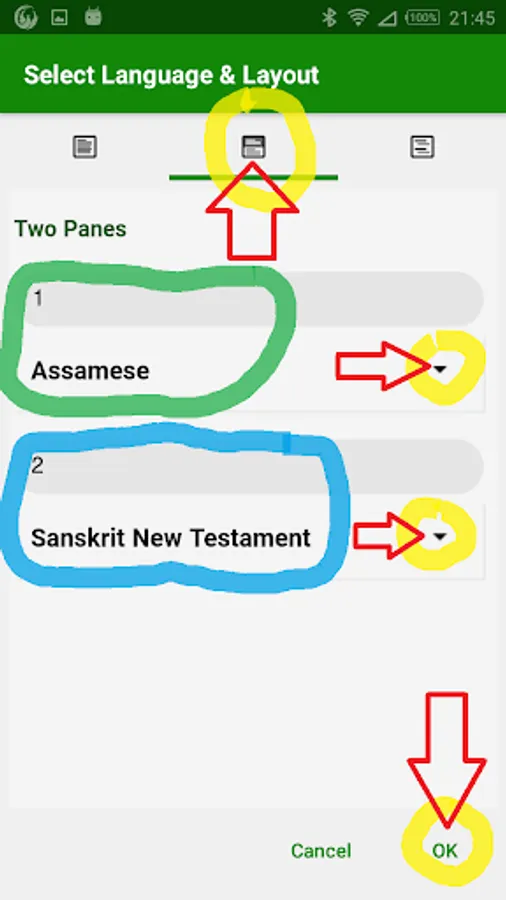 - "two panes" to display the Assamese at the top and the English version, or the Sanskrit New Testament version at the bottom