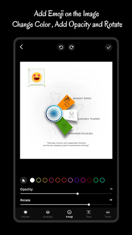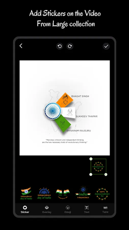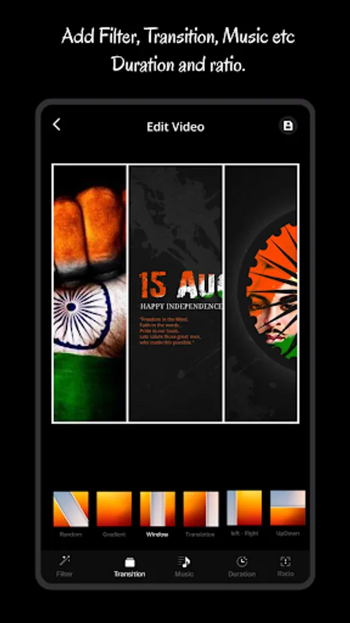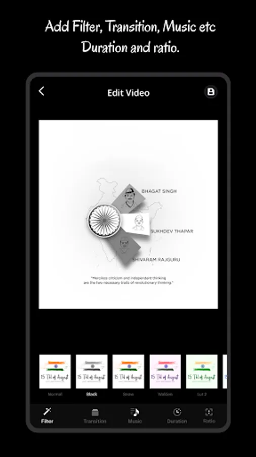 - Apply Photo filter, Add text, Add sticker and rotate your selected photos for Independence day videos.