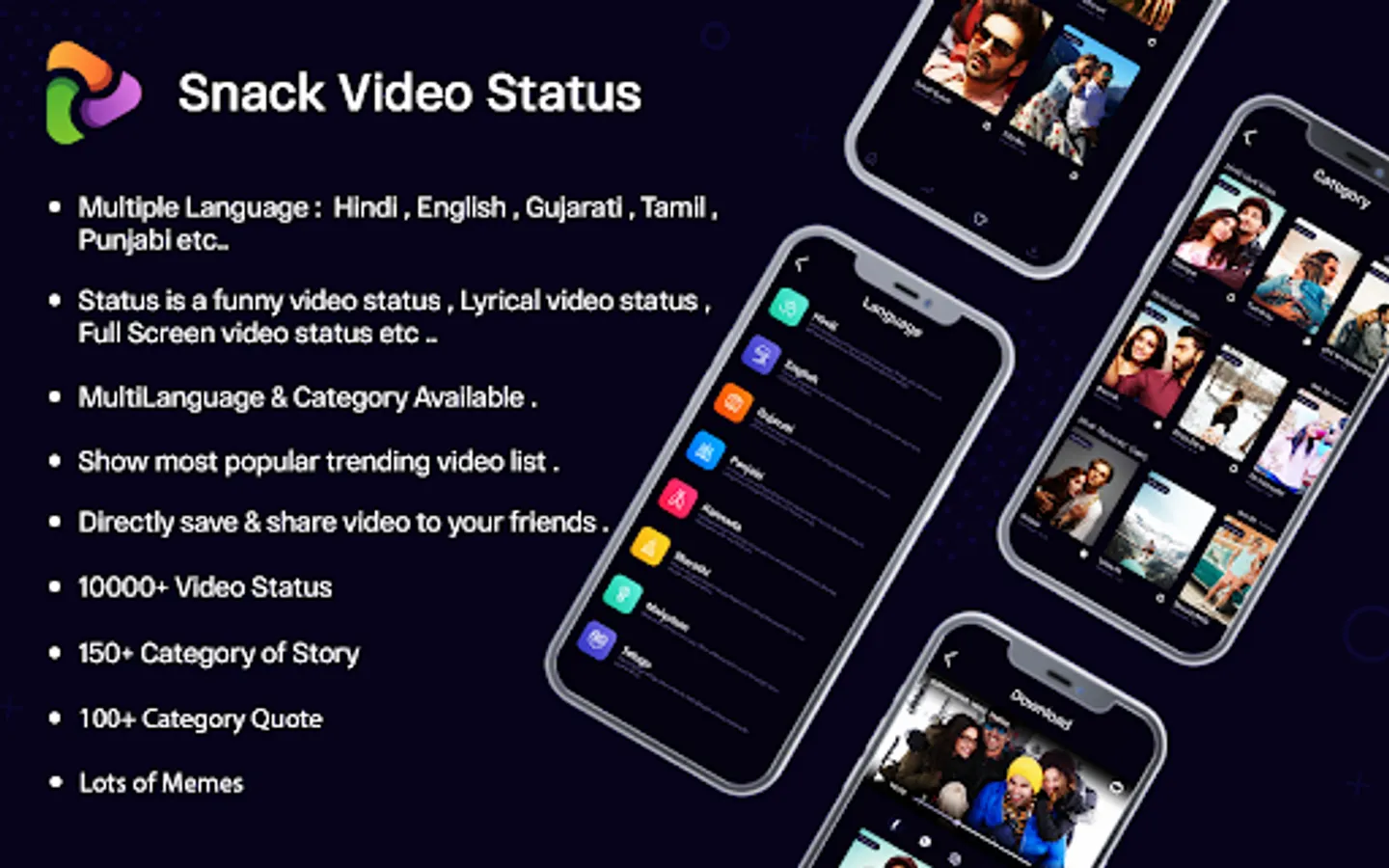 Snake Video Status - Short Video is a WhatsApp status saver app and snack video status maker that allows you to download funny Moj videos and sharechat Status Videos and create amazing funny snack videos. snack Video For wp app serves a variety of short 30 second status videos which is suitable to post on WhatsApp & Instagram Status & Story directly.